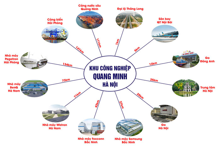 - Khu công nghiệp Quang Minh chỉ cách trung tâm thủ đô 30 phút di chuyển bằng ô tô nên giảm thiểu thời gian đi lại cho mọi người khi có nhu cầu.